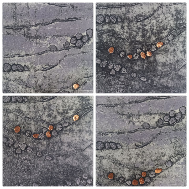 Her particular interest is in creating collagraph prints, which she combines with monoprint and relief techniques. She uses metallic leaf to hint at treasures beneath. Justine loves the endless variations that each inking of a plate brings, each print an original artwork in itself. Her work is inspired by the landscapes around her, from coast to moorland, as well as the geology and industrial heritage of Cornwall. She has a love of abandoned industrial sites that nature has taken back, a glorious mix of colours and textures